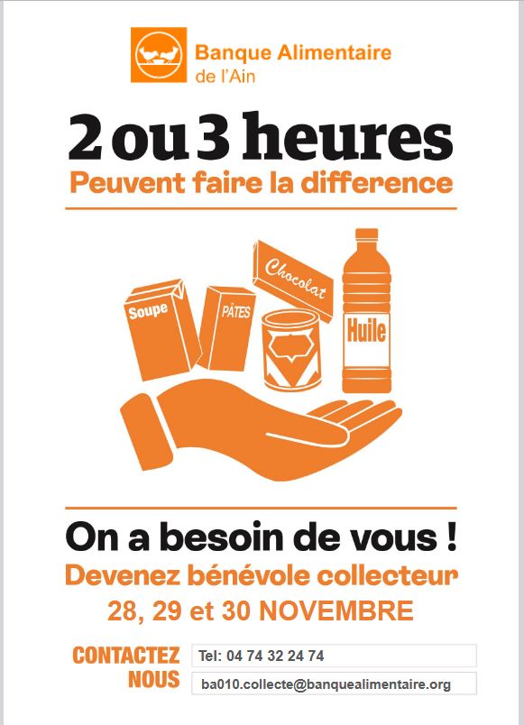 La collecte annuelle de la Banque Alimentaire de l’Ain se déroulera comme traditionnellement fin novembre, cette année les vendredi 28, samedi 29 et dimanche 30 novembre 2025 sur l’ensemble du département. S’agissant d’une opération extrêmement importante pour l’association qui recherche les 1600 bénévoles nécessaires au bon fonctionnement de cette nouvelle édition.
