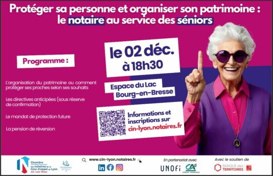 La Chambre interdépartementale des notaires de la Cour d’appel de Lyon organise une conférence sur le thème « Protéger sa personne et organiser son patrimoine : le notaire au service des séniors » le 2 décembre 2025, destinée aux séniors à l’Espace du Lac, 01000 Bourg-en-Bresse à 18h30.