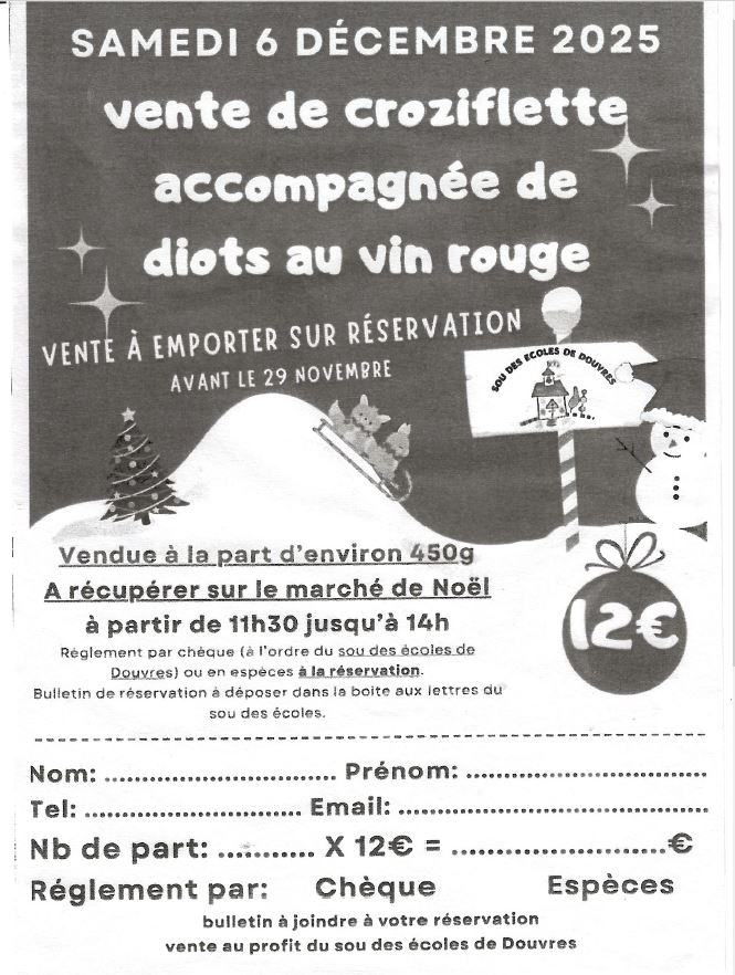 Samedi 6 décembre 2025 : la croziflette et les diots du Sou des Ecoles