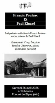 A 16h au Prieuré de Blyes, le duo Phidylé – Emmanuel Cury baryton et Sandra Chamoux, piano – revient à Blyes avec au programme l’intégrale des mélodies de Francis Poulenc sur des poèmes de Paul Eluard, accompagné par le poète-comédien Iokanaan : un concert-spectacle où s’entrecroisent musique, poésie, théâtre, peinture avec projections d’oeuvres pour le cycle de neuf mélodies Le travail du peintre.