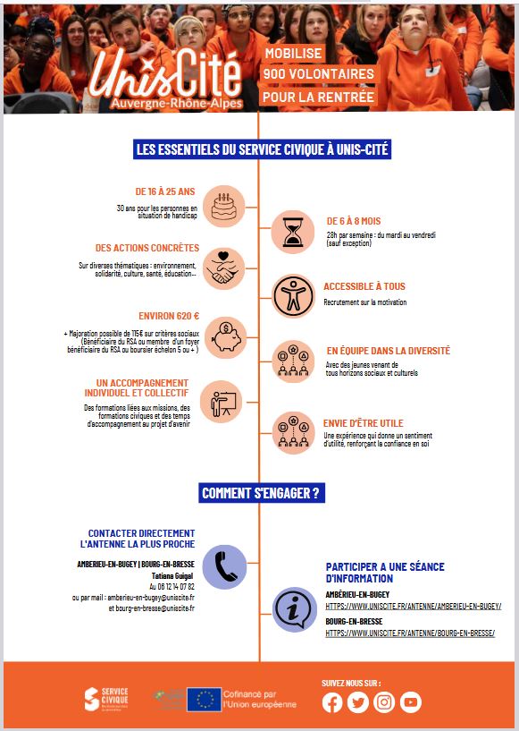 Les missions proposées durent 8 mois et démarrent le 13 octobre 2026 sur le territoire d’Ambérieu-en-Bugey et ses environs: nous proposons donc aux jeunes qui souhaiteraient se renseigner de participer à une séance d’information en s’inscrivant sur https://www.uniscite.fr/antenne/amberieu-en-bugey/