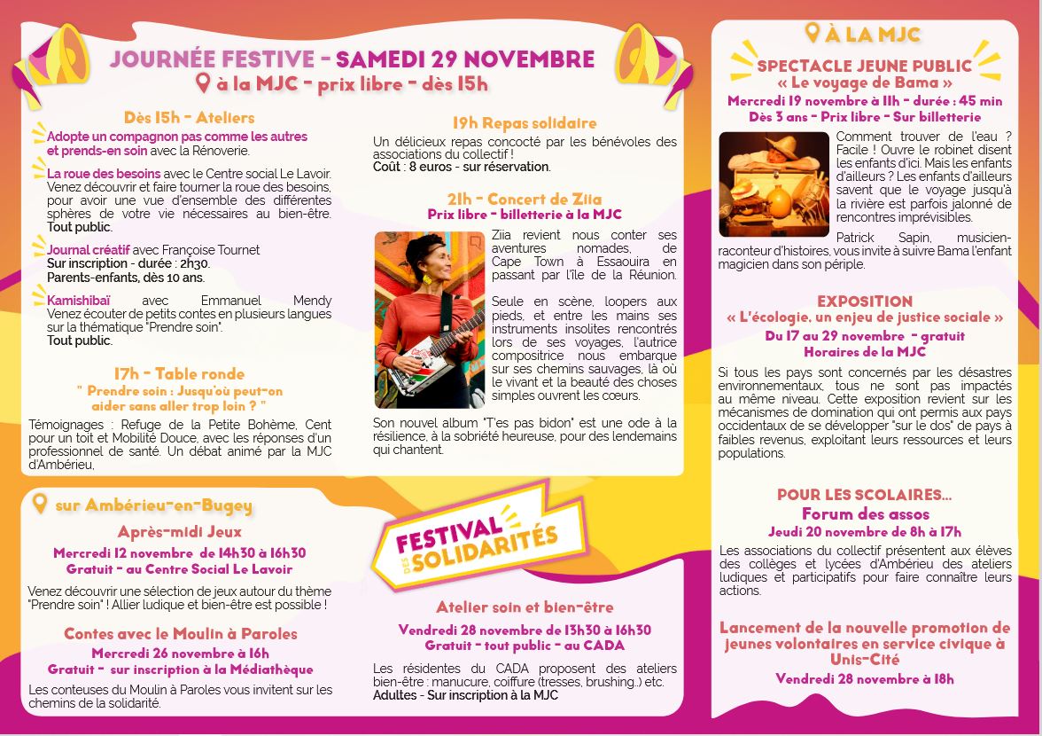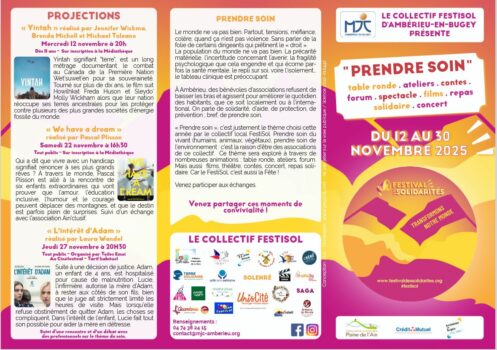 Novembre : c’est le retour du Festival des Solidarités. Cette édition se propose d’explorer le thème « Prendre soin » (des humains, des animaux, de l’environnement).