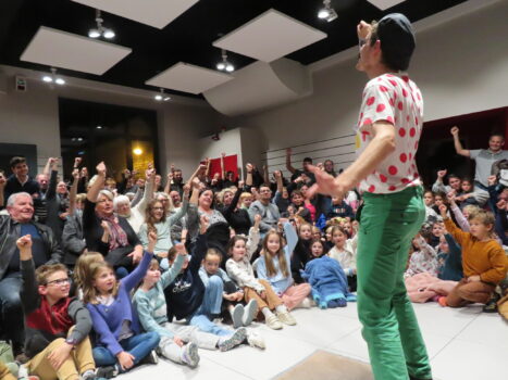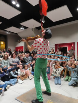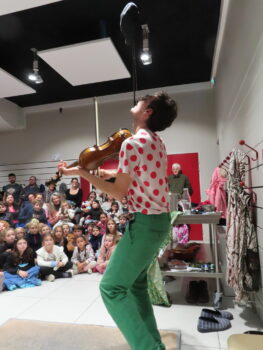 Il jongle (même avec 3 violons et des gants de ski), il plaisante, il gère les enfants devant lui et fait participer le public.