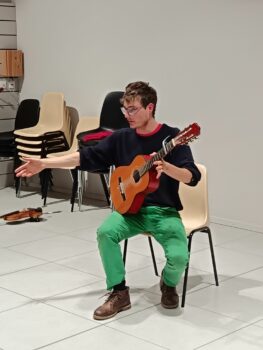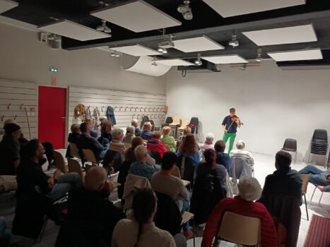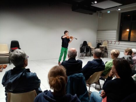 Tom a joué du violon, du classique, de la musique irlandaise, puis, accompagné de sa guitare, il a chanté et récité des poèmes devant environ 35 spectateurs qui se sont régalés de sa prestation.