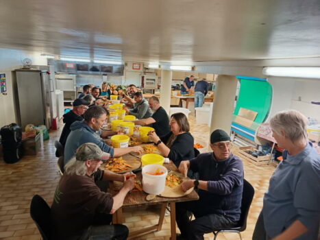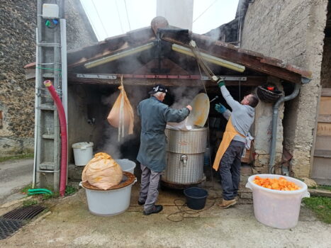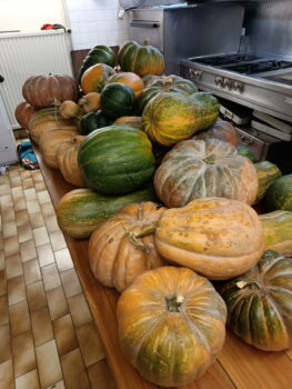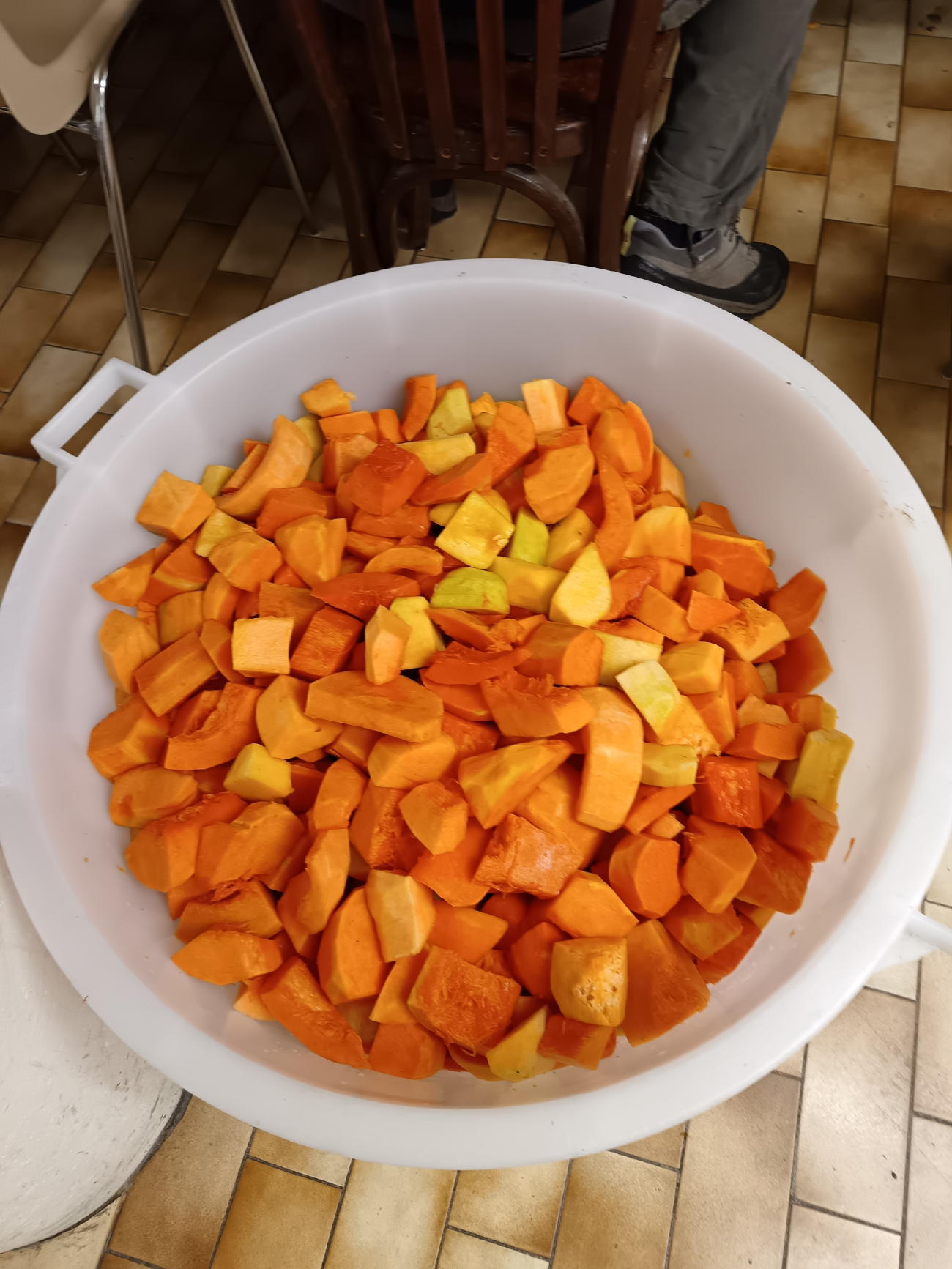 Une vingtaine de personnes des différentes associations du village et du Comité des Fêtes se sont réunies tôt ce samedi matin pour la découpe, épluchage, cuisson, égouttage de 520 kg de courge pour préparer la Fête des Fours 2026.
