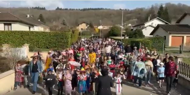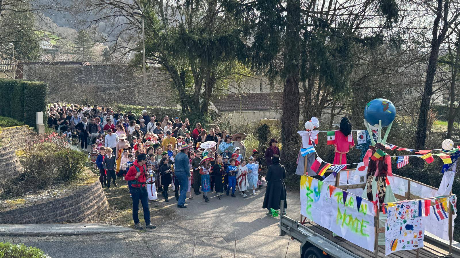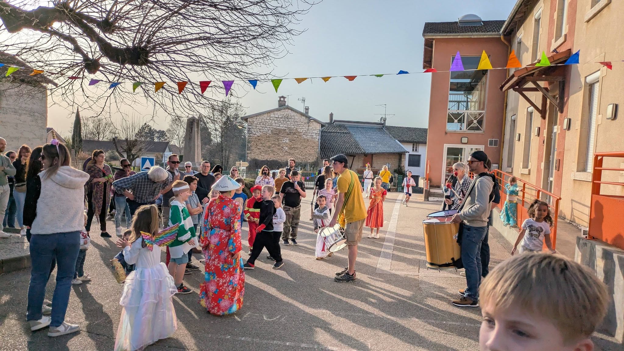 Le char de Monsieur Carnaval a déambulé dans le village au son des tambourins, cymballes, et autres percutions de quelques élèves des petites classes qui criaient pour donner du rythme au défilé.